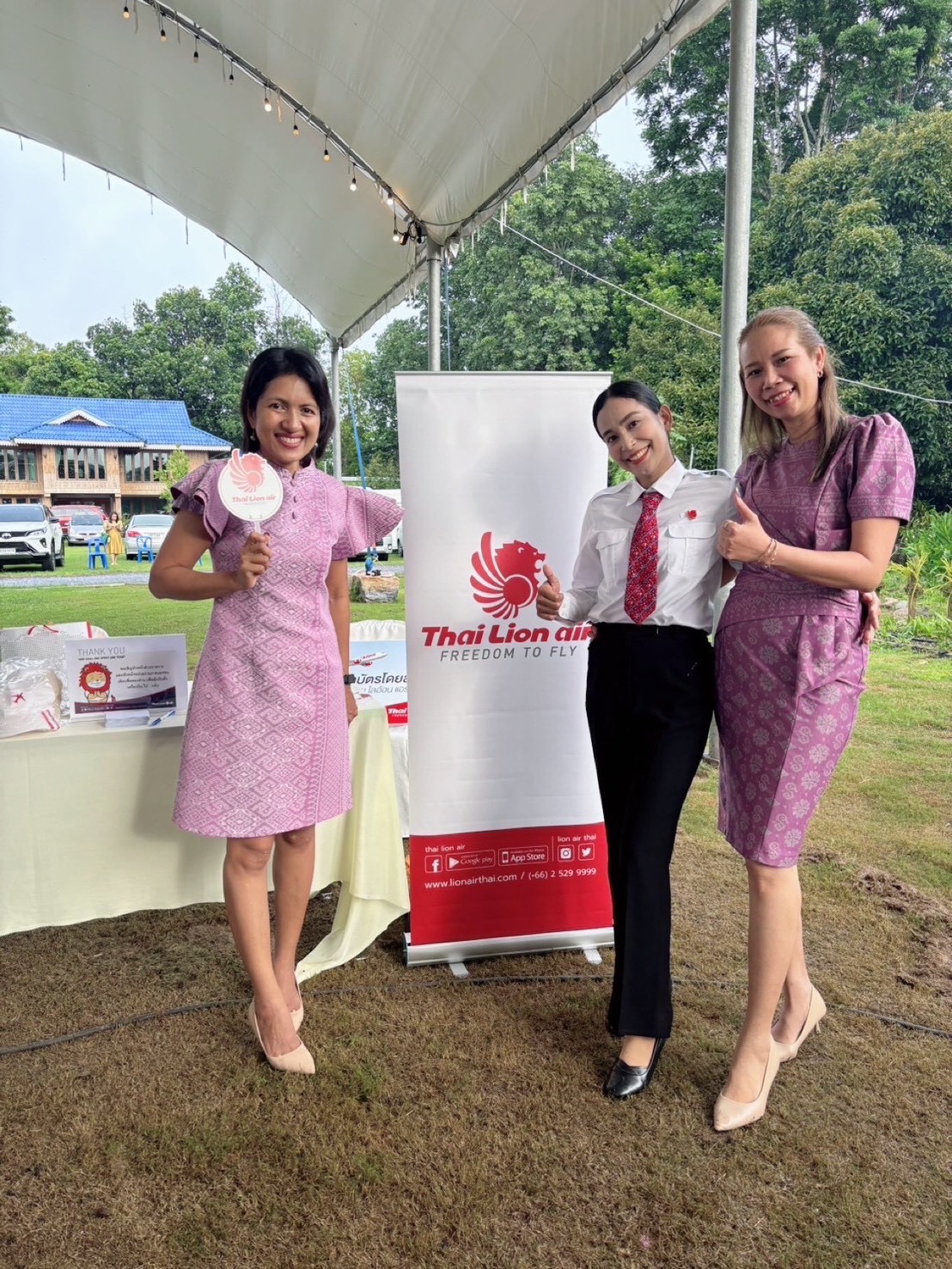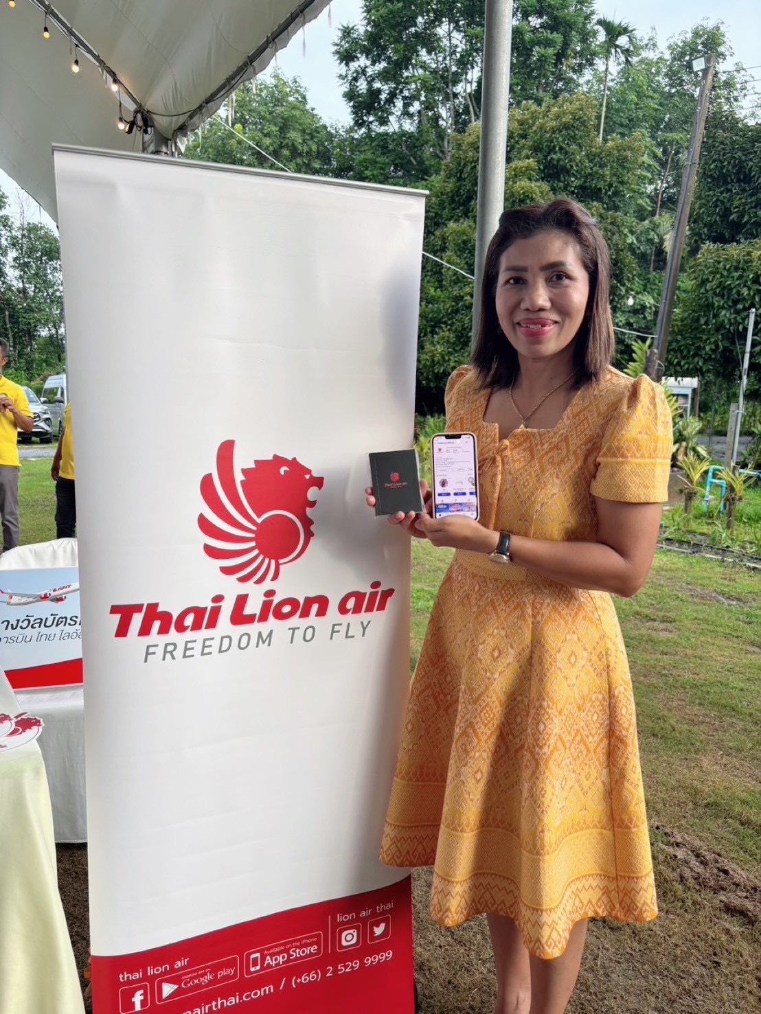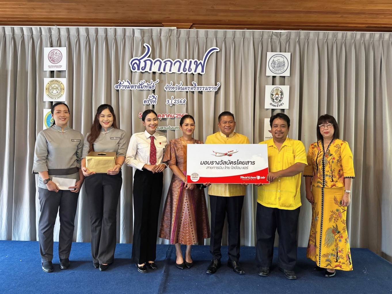นางสาวศิรินาถ ศรีชาย ผู้จัดการสถานีนครศรีธรรมราช สายการบินไทย ไลอ้อน แอร์ ร่วมสนับสนุนมอบบัตรโดยสารเป็นของรางวัลในงาน “สภากาแฟ สร้างมิตรสัมพันธ์” ครั้งที่ 3 ประจำปี 2568 ซึ่งจัดขึ้นเมื่อวันที่ 14 ตุลาคม 2568 ณ บ้านสวนอิงนคร By Mk จังหวัดนครศรีธรรมราช