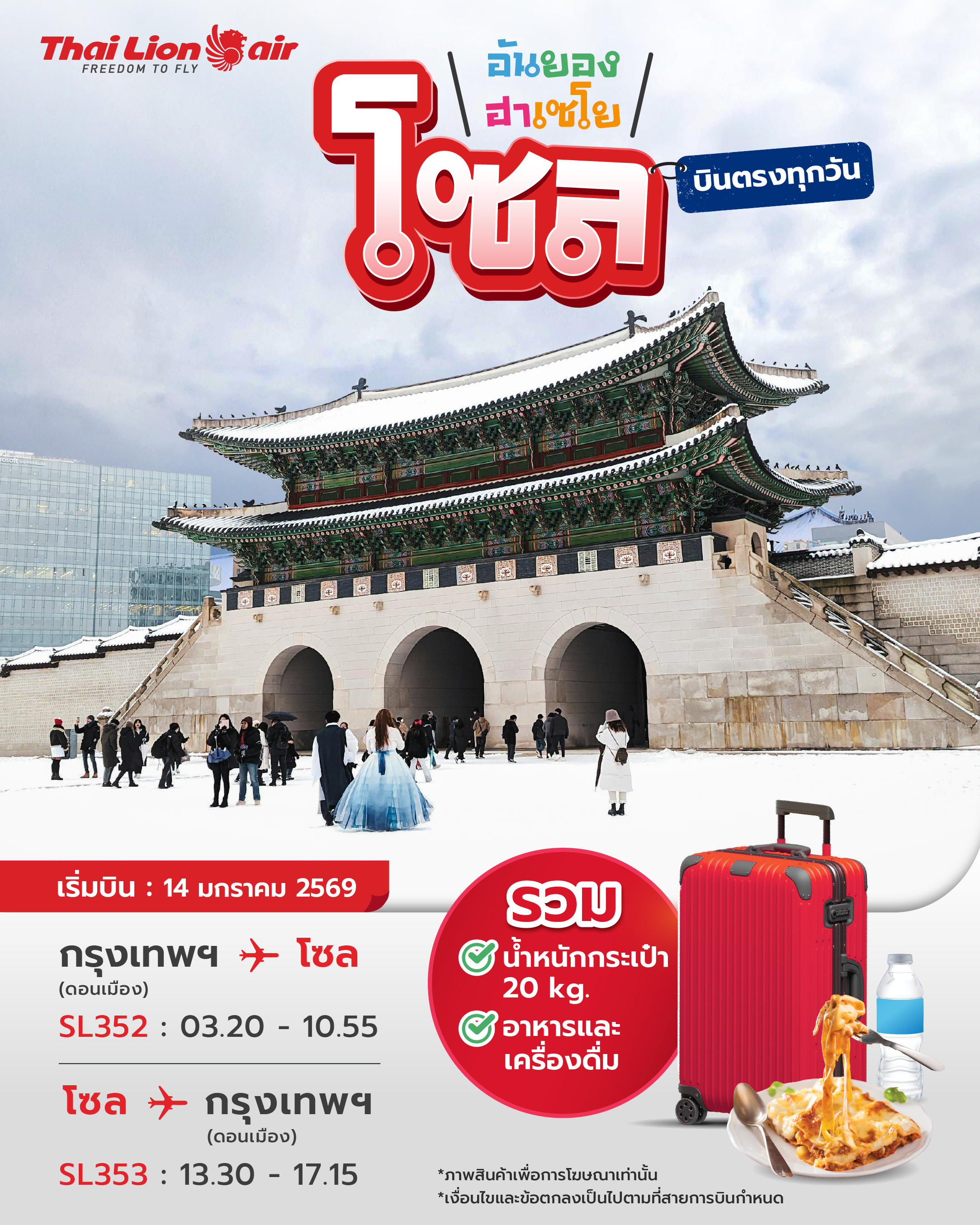ทั้งนี้สายการบินไทย ไลอ้อน แอร์มีความพร้อมเป็นอย่างยิ่งที่จะให้บริการแก่ผู้โดยสารทุกท่านเดินทางสู่กรุงโซล (Seoul) ประเทศเกาหลีใต้ เมืองหลวงที่เต็มไปด้วยเสน่ห์ทางวัฒนธรรม ประวัติศาสตร์ และความบันเทิง ไม่ว่าจะเป็นการช้อปปิ้งที่เมียงดง–ฮงแด (Myeongdong-Hongdae), เยี่ยมชมพระราชวังเคียงบกกุง (Gyeongbokgung Palace), ชมวิวจากหอคอยเอ็นโซล (N Seoul Tower), สนุกสนานเต็มวัน